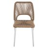 Μοντέρνα καρέκλα κατασκευασμένη από σκελετό αλουμινίου σε λευκή απόχρωση, επενδυμένη με πλεκτό ενισχυμένο PE σχοινί στο κάθισμα και στην πλάτη σε μπεζ απόχρωση.