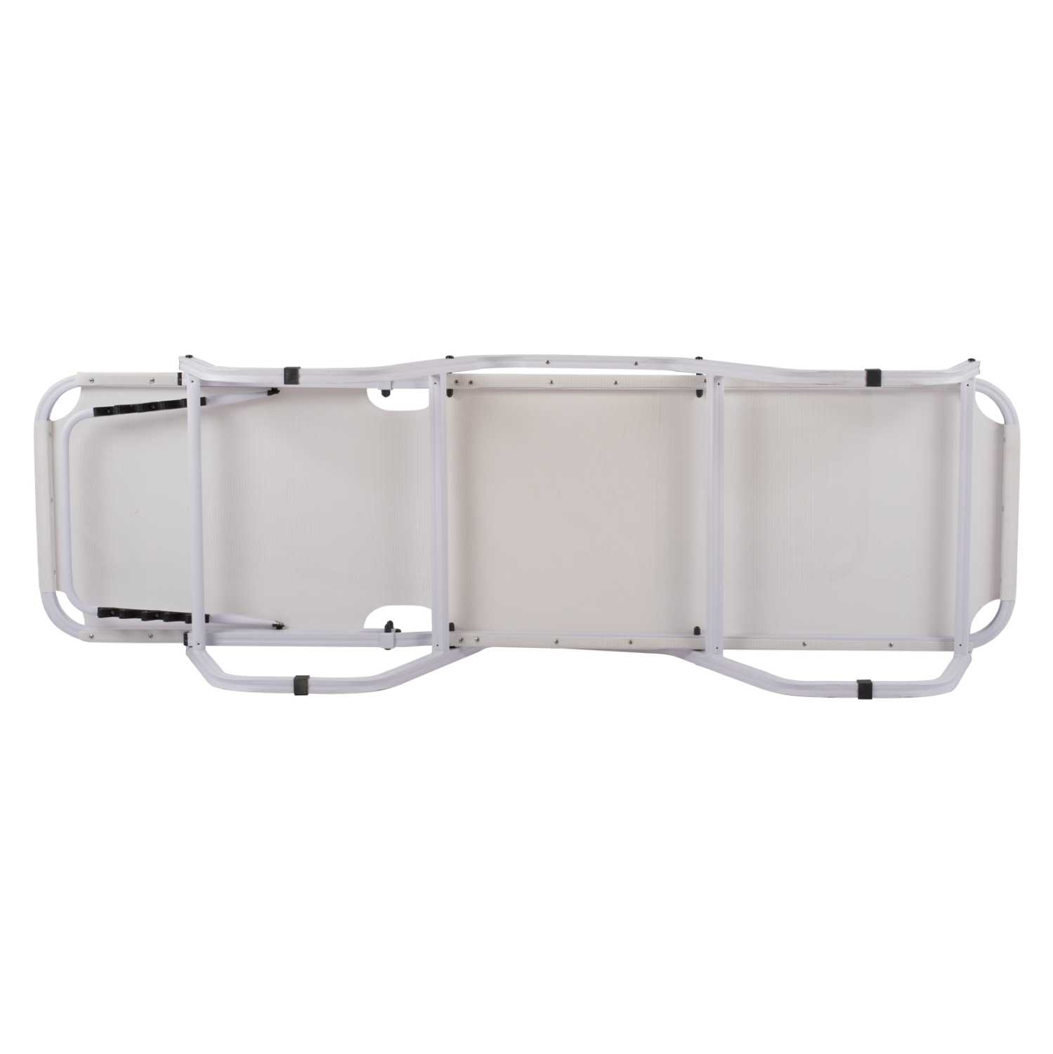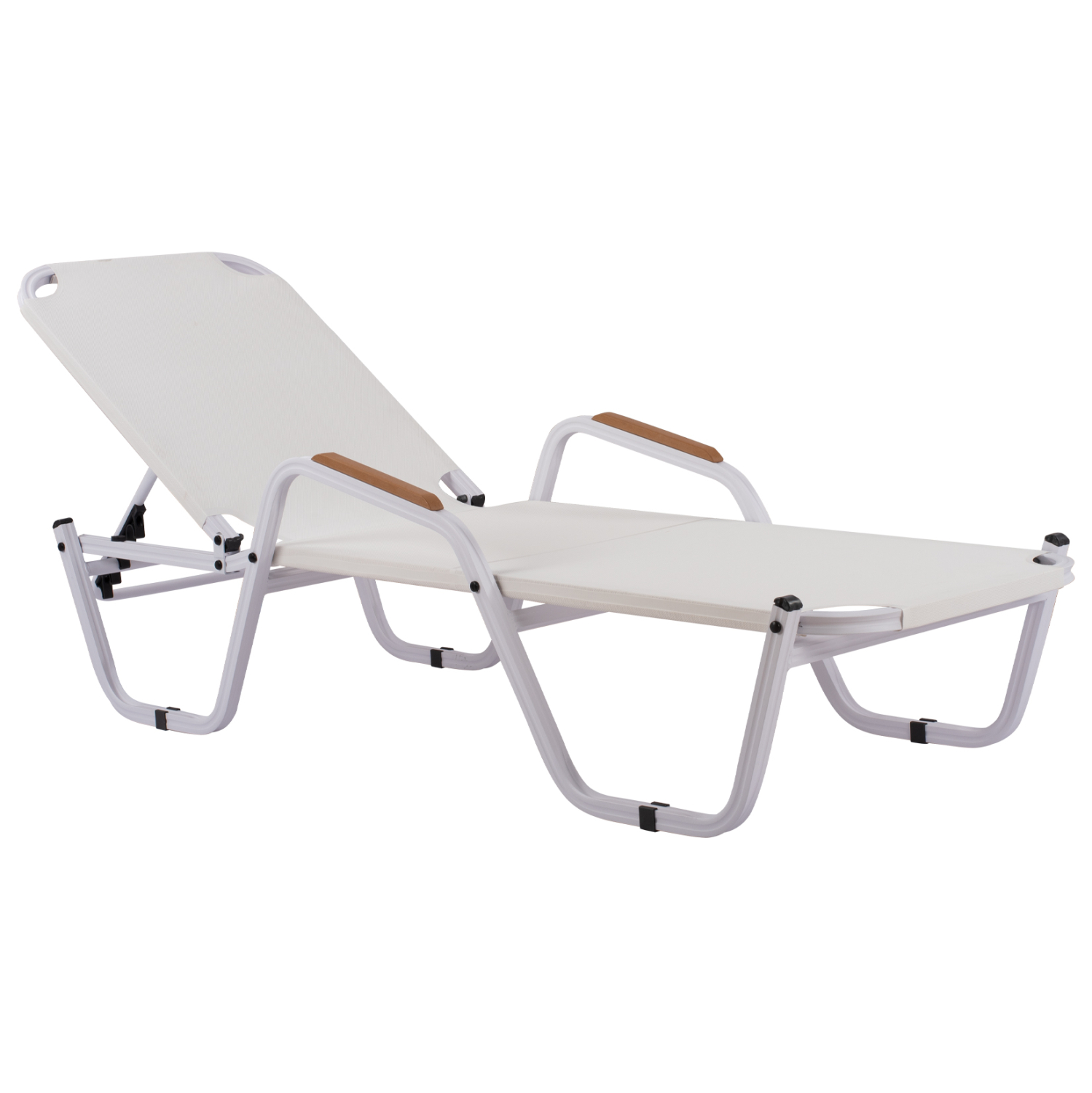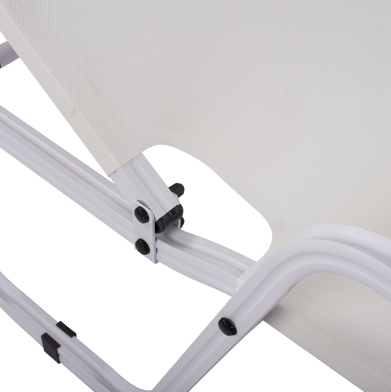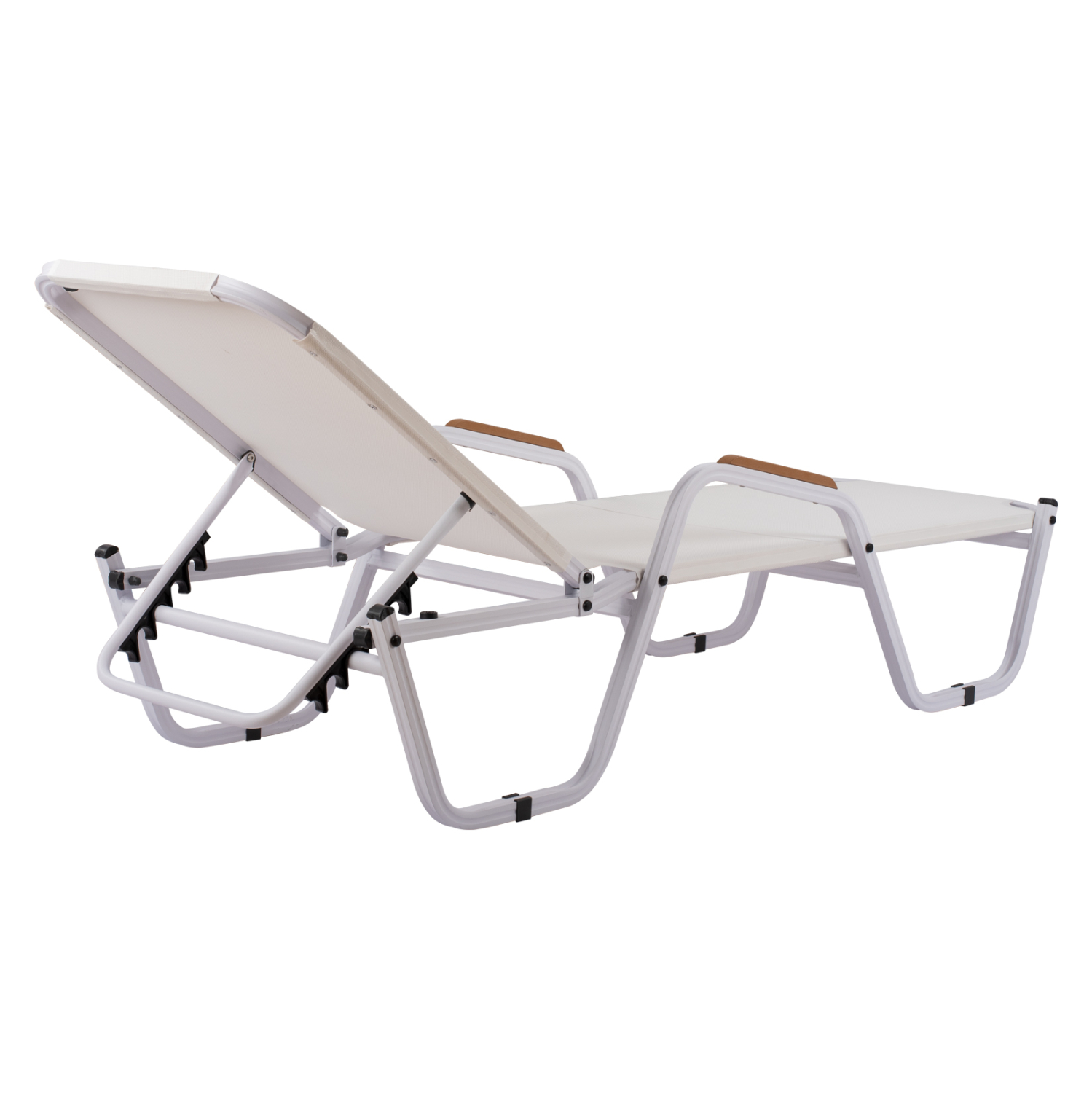 Η επένδυση της ξαπλώστρας έχει γίνει με αδιάβροχο ενισχυμένο ύφασμα textilene (2Χ1- 600gr). Αυτό είναι ένα παχύ, ισχυρό και ανθεκτικό πολυεστερικό ύφασμα. Σημαίνει ότι είναι κατασκευασμένο από πολυεστερικά νήματα υφασμένα από άκρη σε άκρη, και είναι επικαλυμμένο με PVC.