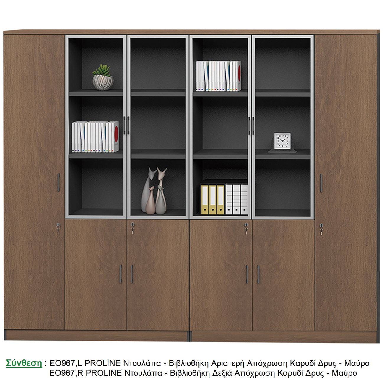 Proline Ντουλάπα Βιβλιοθήκη Γραφείου Δεξιά, Πεντάφυλλη (2 Γυάλινα) Καρυδί Δρυς Μαύρο - ΕΟ967.R