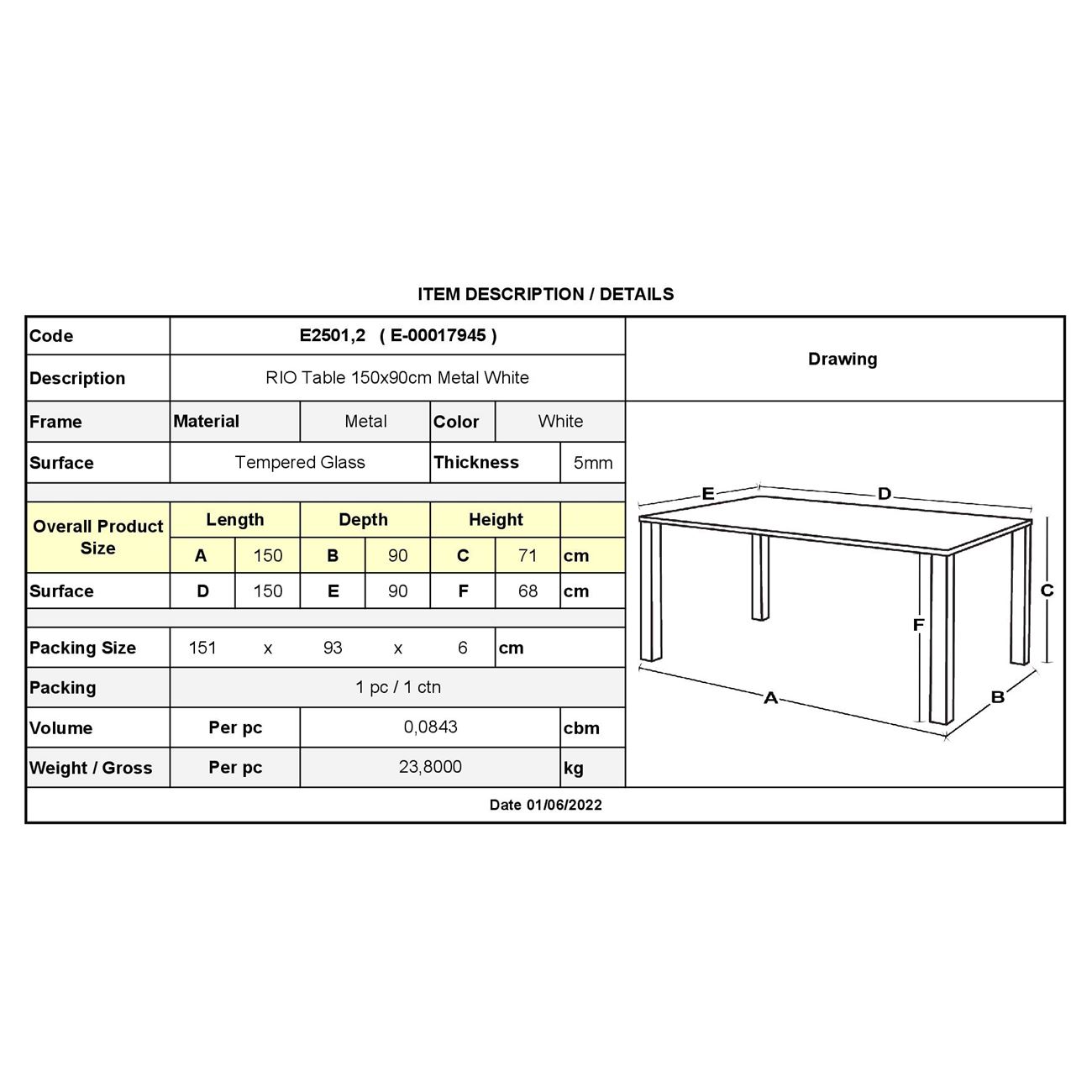 Ε2501,2 - RIO Τραπέζι 150x90cm Μεταλλικό Άσπρο/Γυαλί