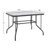 Ένα τραπέζι κατασκευασμένο από μεταλλικό σκελετό σε γκρι απόχρωση με γυάλινη επιφάνεια.