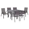 Ένα τραπέζι τραπεζαρίας μεταλλικό εξωτερικού χώρου σε γκρι απόχρωση με ενσωματωμένο τζάμι ασφαλείας (secure).
