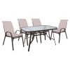 Τέσσερις πολυθρόνες εξωτερικού χώρου από μεταλλικό σκελετό σε καφέ χρώμα με textilene 2x1 μεγάλης αντοχής σε ήλιο και βροχή, με αδιάβροχο μαξιλάρι σε μπεζ απόχρωση.