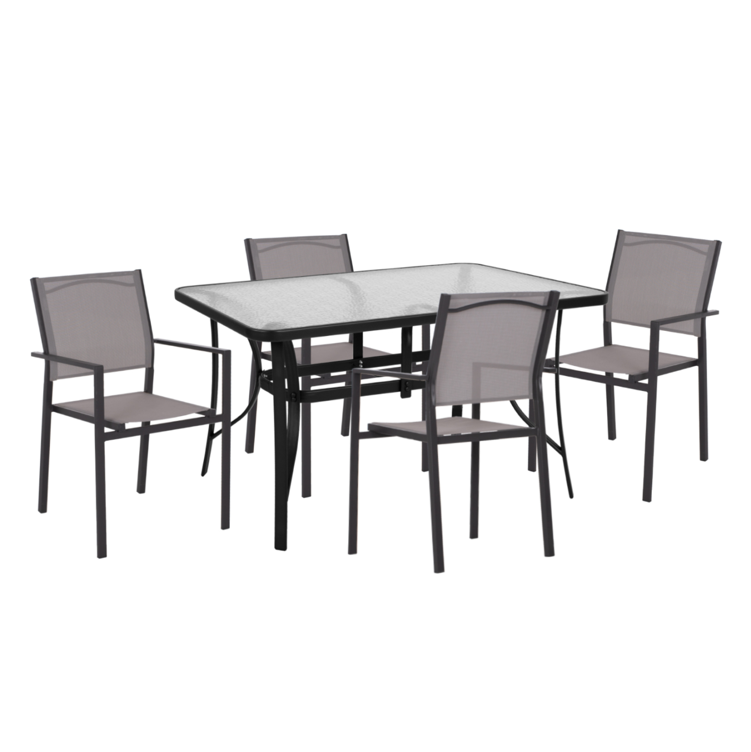 ΗΜ11795Σετ εξωτερικού χώρου με τραπέζι με ΓΚΡΙ μεταλλικό σκελετό και γυάλινη θολή ΕΝΙΣΧΥΜΕΝΗ επιφάνεια και 4 μεταλλικές πολυθρόνες με textilene σε ΓΚΡΙ χρώμα.