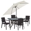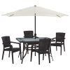 Ένα τραπέζι τραπεζαρίας εξωτερικού χώρου κατασκευασμένο από μεταλλικό σκελετό σε καφέ απόχρωση με ενσωματωμένο τζάμι ασφαλείας (secure) και θέση για ομπρέλα.