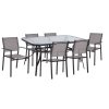 ΗΜ11789Σετ εξωτερικού χώρου με τραπέζι με ΓΚΡΙ μεταλλικό σκελετό και γυάλινη θολή ΕΝΙΣΧΥΜΕΝΗ επιφάνεια και 6 μεταλλικές πολυθρόνες με textilene σε ΓΚΡΙ χρώμα.